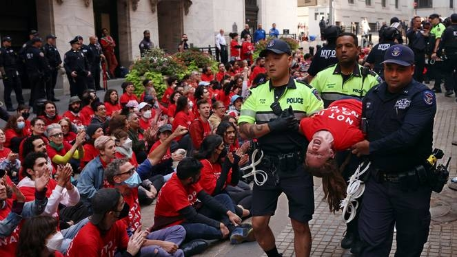 Waandamanaji hao, wengi wao kutoka kwa vikundi vya wanaharakati kama vile Sauti ya Kiyahudi ya Amani, waliimba Jumatatu, “Let Gaza live” na “Komesha ufadhili wa mauaji ya kimbari” mbele ya jengo la kubadilishana karibu na Wall Street chini ya Manhattan.