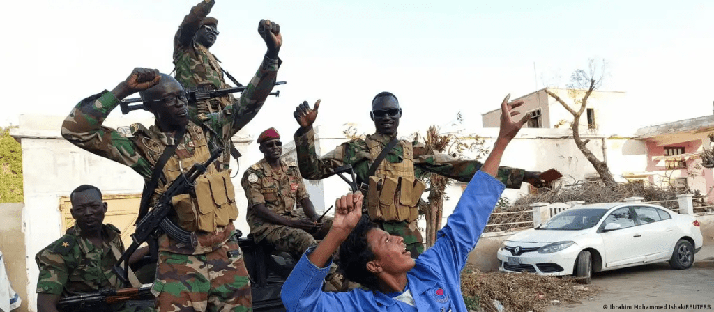Raia wa Sudan akisherehekea na wanajeshi kufuatia tangazo la jeshi kwamba lilitwaa mji wa Wad MadaniPicha: Ibrahim Mohammed Ishak/REUTERS